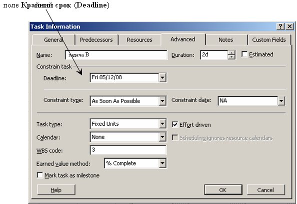 Для установки крайнего срока необходимо вызвать диалоговое окно " Информация о задаче" (Task Information) - сделать двойной щелчок на названии задачи или, выделив задачу, щелкнуть кнопку " Информация о задаче" (Task Information) на панели Стандартная. В диалоговом окне, на вкладке " Дополнительно" (Advanced), внести (или выбрать в календаре) нужную дату.