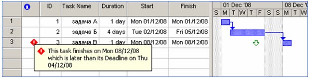 Если при изменении каких-либо параметров в плане проекта выполнение задачи не может быть завершено в указанный срок, в поле Индикаторы (Indicators) появляется красный значок, при наведении на него указателя мышки отображается всплывающая подсказка с информацией о выходе за крайний срок.