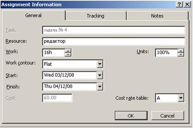 Вкладка General (Общая) диалогового окна Assignment Information (Информация о назначении) содержит поля Start (Начало) и Finish (Окончание). По умолчанию, значения этих полей заполняются датами начала и окончания задачи. Если период работы ресурса над задачей определяется другими датами - значения полей Start (Начало) и Finish (Окончание) могут быть отредактированы.