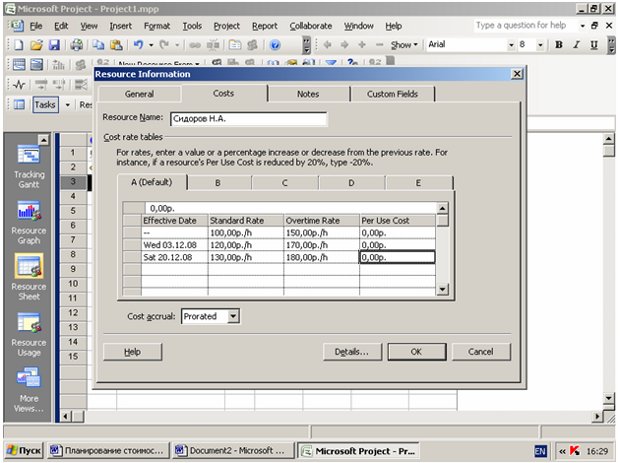 В среде MS Project cтоимость использования ресурса определяется в окне Resource information (Информация о ресурсе) на вкладке Costs (Затраты) посредством ввода значений в Таблицы норм затрат.