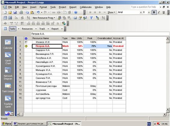 Ресурсы с превышением доступности можно просматривать в представлениях Resource Sheet (Лист ресурсов), Resource Usage (Использование ресурсов) и Resource Allocation (Выделение ресурсов).