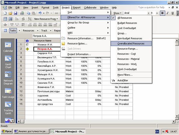 Список ресурсов с превышением доступности можно отфильтровать. Для этого можно применить фильтр Overallocated Resources: