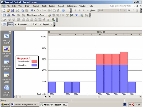 Также этот инструмент можно использовать в представлениях Gantt Chart (Диаграмма Ганта) и Task Sheet(Лист задач), отображающих списки задач, для выбора и выделения задач с ресурсами, доступность которых превышена. Превышение доступности ресурса также можно отобразить графически, используя представление Resource Graphs (График ресурсов).