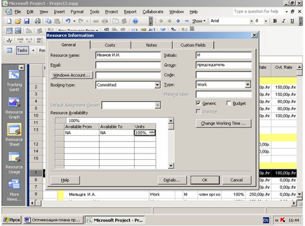 Эти изменения производятся в окне Resource Information (Сведения о ресурсе) в таблице Resource Availability (Доступность ресурса) в столбцах Available To (Доступен по) и Units (Единицы) соответственно.