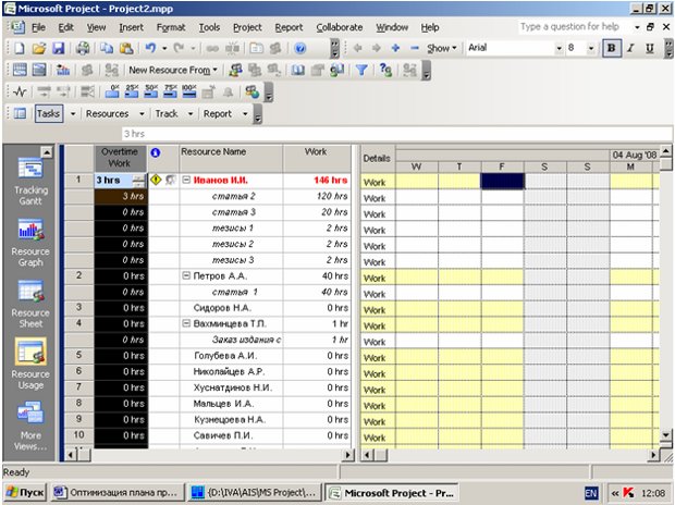 Снизить нагрузку на ресурс можно, введя для него некоторое количество часов сверхурочного времени. При этом не потребуется менять общий объем работы, запланированный на обычное рабочее время. При расчете MS Project будет вычитать часы, запланированные, как сверхурочные, из общего объема работы. Издержки этого метода в том, что сверхурочная работа оплачивается дороже. Но затраты могут оказаться ниже, чем они могли бы быть при привлечении нового ресурса. Порядок работы MS Project при использовании сверхурочного времени будут следующий: