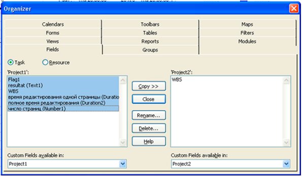 Покажем, как можно легко перенести уже созданные настраиваемые пользовательские поля из одного файла в другой. Откроем одновременно два файла: первый, в котором уже есть нужные нам поля, и второй, в который их надо перенести, project1.mpp и project2.mpp. Затем командой Tools>Organizer(Сервис>Организатор) откроем окно Organizer (Организатор) и в открывшемся окне перейдем на вкладку Fields(Поля). Предположим, что созданные нами поля относились к задачам, поэтому установим переключатель Task(Задачи), и выберем в выпадающем списке в левой части окна файл project1.mpp, а в правой – файл project2.mpp. Теперь, выделив нужные поля, и щелкнув по кнопке Copy(Копировать), добавим поля в новый файл project2.mpp. Мы хотим уточнить длительность задач, и в качестве параметра для расчетов нам удобно использовать общее время редактирования каждой статьи. Название перенесенных нами полей возможно были другими, поэтому обычным образом (как и при создании новых полей) переименуем поля, назовем их "Число статей" и "Время редактирования статьи". В процессе расчетов длительности с введением параметра уже имеющиеся в таблицах проекта данные могут быть изменены программой. Следовательно, прежде, чем начать расчеты, удобнее создать копию таблицы Entry(Ввод данных), отобразить в ней новые поля и всю дальнейшую работу производить с копией. Напомним, что для этого достаточно выбрать в меню команду View > Table > more tables (Вид таблица другие таблицы), найти нужную таблицу Entry(Ввод данных) и нажать copy(копировать). Не забудьте включить флажок "отобразить в меню". Чтобы исключить задачи, которые никак не связаны с обработкой статей, создадим новое поле типа Flag, назовем его "обработка статей". Затем добавим в таблицу столбец с этим полем и установим в нем значение "да" для тех задач, длительность которых мы можем рассчитывать по параметрической формуле. Потом отфильтруем таблицу по этому полю (для этого следует включить автофильтр в строке главного меню и выбрать нужный пункт в выпадающем окне). На экране останутся только те задачи, которые содержат в этом поле значение "да". При этом, разумеется, эти задачи будут исключены только из вида таблицы, но не из проекта.