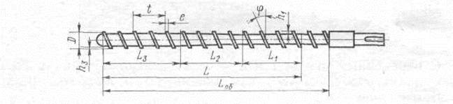 Основные регулируемые технологические параметры – это частота вращения червяка и продольное распределение температур. Основные конструктивные параметры экструдера – диаметр и длина червяка, обычно задаваемая отношением длины червяка к диаметру. Данные параметры в значительной степени определяют производительность экструдера, время пребывания в нем полимера. В свою очередь конструкция червяка имеет геометрические параметры, редставленные на рис.1.