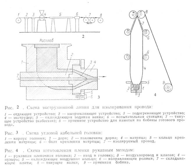 Изоляция проводов одна из многочисленных областей применения экструзии. Схема изоляции проводов приведена на рис.2 и рис.3. Технология выглядит следующим образом. Металлический провод подается к фильере с разматывающего устройства и проходит через угловую головку. Изолированный провод выходит из фильеры и попадает в водяную охлаждающую ванну. Затем он проходит через электрический контроллер, где проверяется целостность изоляции поступающей к приемному устройству.