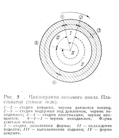 Расплав полимера подается в форму с помощью плунжера или за счет осевого перемещения червяка. В настоящее время практически все современные литьевые машины имеют червячные пластикаторы с возвратно-поступательным перемещением червяка. Во вращение червяк приводится специальным гидромотором. Осевое перемещение осуществляется за счет гидравлической системы. У существующих машин величина впрыска составляет от нескольких грамм до нескольких килограмм, а усилие смыкания достигает 50 МН. Подробно рассмотреть процесс литья под давлением позволяет циклограмма литьевого цикла, представленная на рис.5.