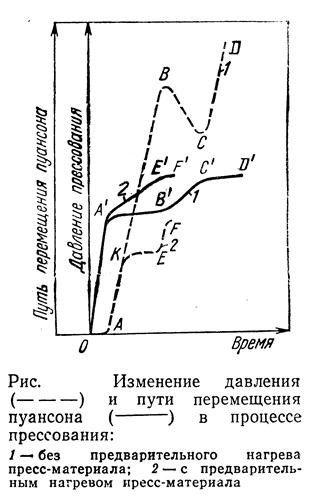В случае прессования изделий из предварительно нагретого материала (кривые 2) смыкание пресс-формы сначала происходит практически с постоянной скоростью перемещения пуансона (отрезок А'Е'). При этом во время уплотнения материала давление резко возрастает (участок А К), а во время растекания материала в полости пресс-формы оно остается почти на постоянном уровне (отрезок КЕ). Заключительная стадия прессования завершается так же, как и в первом случае: давление возрастает до заданного значения (участок ЕF, а скорость прессования постепенно уменьшается до нуля (участок E’F’)