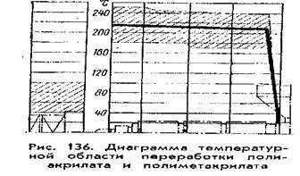 Полиакрилаты и полиметакрилаты трудно перерабатывать, так как температуры размягчения и разложения этих полимеров близки, а вязкость расплава большая. Температура литья различных марок составляет от 180 до 250° С. При превышении этой температуры