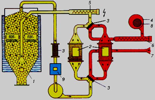 Устройство специального агрегата для сушки ПЭТ показано на рисунке. Сырье засасывается из мешка вакуумным загрузчиком (на рисунке не показан). Загрузчик имеет собственное дозирующее устройство, с помощью которого гранулы ПЭТ порционно подаются в бункер таким образом, чтобы он был всегда заполнен сырьем. Сырье перемещается в бункере сверху вниз так, чтобы во время пребывания каждой порции в бункере было не менее четырех часов. Снизу в бункер через выходное сопло подается подогретый нагревателем воздух. Отобрав влагу от сырья, воздух через фильтр и холодильник попадает в адсорбер-осушитель и затем снова в бункер. Адсорберов два. Когда один работает, другой регенерируется. В рабочем контуре датчики непрерывно измеряют степень сухости воздуха - точку росы. Превышение допустимого значения точки росы является сигналом того, что рабочий адсорбер пресыщен, заслонки автоматически переключаются, и роль адсорберов меняется.
