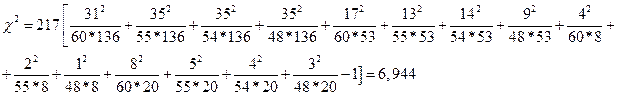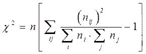 Если исходные данные представлены в таблице, в которой 3 и более рядов, то для определения тесноты связи между этими признаками используется коэффициент взаимной сопряженности Пирсона, который рассчитывается по формуле: