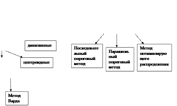 Метод оптимизирующего распределения – отличается от двух предыдущих пороговых методов тем, что объекты можно впоследствии перераспределить, чтобы оптимизировать суммарный критерий. Например, среднее внутрикластерное расстояние для данного числа кластеров.