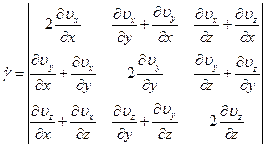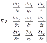 В общем случае течение, возможно, более чем одно ненулевое направление градиента скорости. Каждый из трёх компонентов скорости может изменяться в трёх координатных направлениях, что даёт девять возможных компонент градиента. Таким образом, можно ввести тензор градиентов скорости Ñu, который в декартовых координатах запишется: