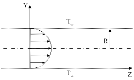 Рассмотрим ламинарное установившееся стационарное неизотермическое течение ньютоновской жидкости через длинную трубку круглого сечения радиуса R. Температура стенки трубы Tw поддерживается постоянной. Задача состоит в отыскании распределения скорости и температуры в поперечном сечении трубы, удалённом от входа.