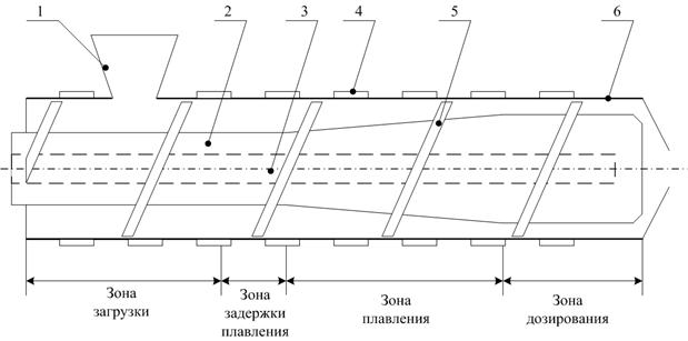 Пара – архимедов винт – цилиндр. Есть также бункер для загрузки полимера, привод, профильная головка.