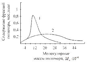 Рис. 8.4. Дифференциальные кривые для полимеров с различным молекулярномассовым распределением: 1 – узким (преобладают фракции с молекулярными массами 8¸14×103); 2 – широким (много фракций с разными молекулярными массами - 4×103 до 32×103).
