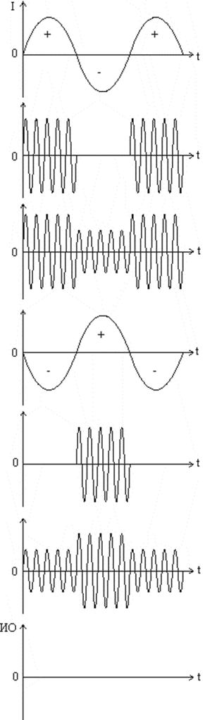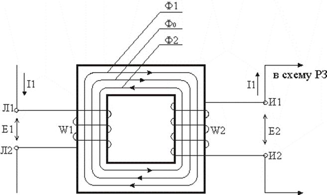 По первичной обмотке протекает ток I1, который создает в магнитопроводе магнитный поток Ф1. Поток Ф1 проходит сквозь обмотку W2 и наводит в ней ЭДС E2. Поскольку вторичные цепи ТТ всегда замкнуты (одно из условий работы трансформатора), то протекает ток I2 по цепи и через обмотку W2. Этот ток наводит в магнитопроводе магнитный поток Ф2, который направлен противоположно потоку Ф1. Результирующий поток Ф0=Ф1-Ф2, направленный как и Ф1, наводит в обмотке W1 противоЭДС Е1. Чем больше нагрузка ТТ, тем больше противоЭДС Е1.