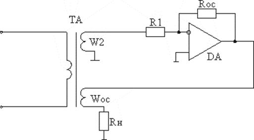 На инвертирующий вход ОУ подаётся сигнал от обмотки W2.Выход ОУ подключен к обмотке обратной связи (ОС) Wос. Сигнал в противофазе трансформируется в магнитопровод. В результате результирующий поток Фрез=Фо-ФWос≈0. Таким образом не будет расхода энергии на перемагничивание ТТ, следовательно не будет возникать погрешностей.