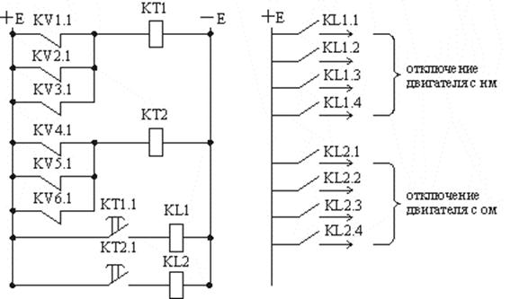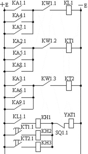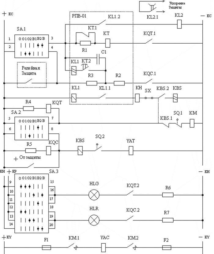 При этом по цепи "+ЕС"- (5-7)SA.2- KBS.1- SQ.1- KM- "-EC" - (1) протекает ток и срабатывает контактор КМ, замыкается контактор КМ1 и КМ2 и электромагнит включения выключателя YAC включает выключатель. Вспомогательный контакт выключателя SQ1 разомкнулся, а SQ2 замкнулся и подготовил цепь отключения к работе. Сработало рел