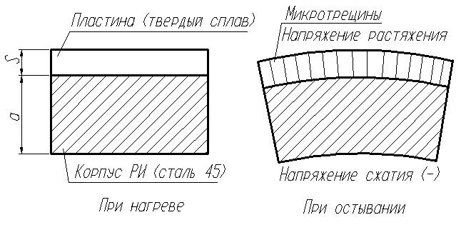 - возможность образования трещин на поверхности из-за разных коэффициентов линейного расширения твёрдого сплава и стали корпуса (у стали он больше);(Рис.18)