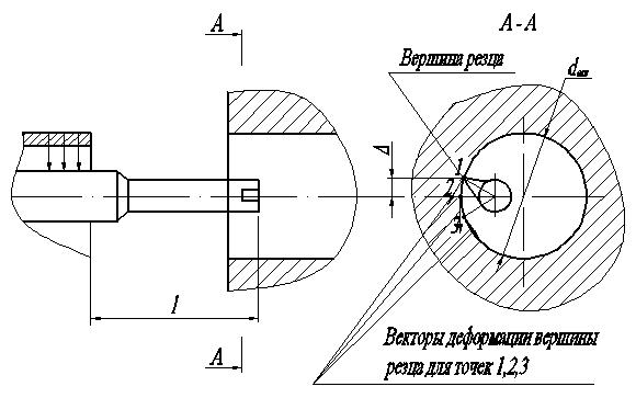 Вершина резца должна быть расположена так, чтобы под действием среднего значения тангенсальной составляющей силы резания вершина резца при резании находилась бы в точке 2 – в этом случае вектор деформации вершины резца совпадает с касательной к окружности диаметром dотв в точке 2. Если при резании вершина резца будет находится выше (смещена на величину ∆) или ниже точки 2 (в точках 1 или 3) то вектор деформации не совпадает с касательной, что приведет к неточности обработки отверстия и возникновению вибраций.