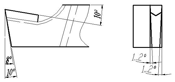 2. В следствии небольшой ширины главных режущих кромок ее прочность недостаточна; для повышения прочности главной режущей кромки приходится назначать небольшие вспомогательные углы в плане φ1≈ (1 - 2º) и задние вспомогательные углы α1≈ (1 - 2º), что снижает стойкость резцов.