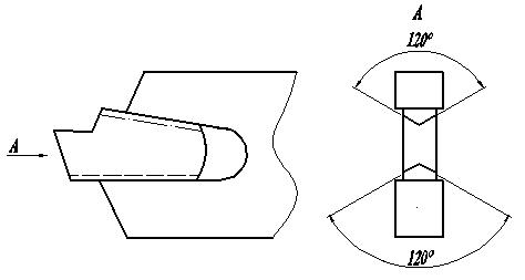 5. с симметричной ломанной главной режущей кромкой, с главным углом в плане φ = (60…80º) для облегчения врезания в заготовку, отрезки без отлома и улучшения условия дробления стружки;