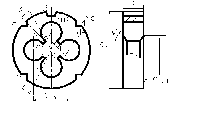 Число стружечных отверстий зависит от резьбы плашки. Плашка затылована по архимедовой спирали на заборных конусах по вершинам резьбы.