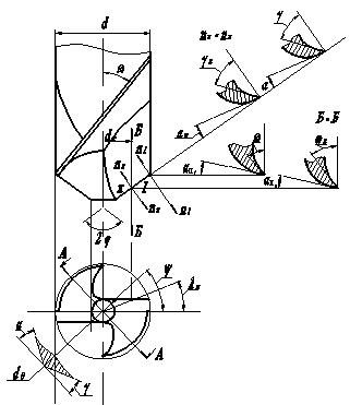 Из формулы 3) следует, что передний угол в продольной плоскости уменьшается от наружного диаметра сверла к его центру.