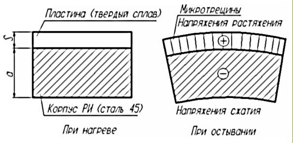 - возможность образования трещин на поверхности из-за разных коэффициентов линейного расширения твёрдого сплава и стали корпуса (у стали он больше);