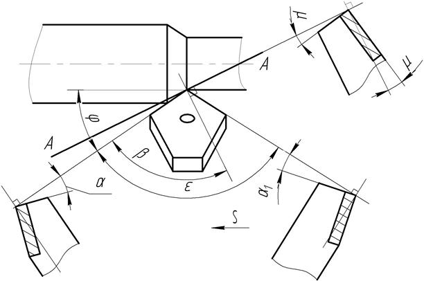 3. Угол b - угол между перпендикуляром к оси поворота опорной поверхности (рис. 4.22) (линия А-А) и проекцией главной режущей кромки на основную плоскость.