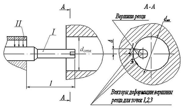 Вершина резца – точка 1, должна быть расположена так, чтобы под действием среднего значения тангенциальной составляющей силы резания вершина резца при резании находилась бы в точке 2 – в этом случае вектор деформации вершины резца совпадает с касательной к окружности диаметром dотв в точке 2. Если при резании вершина резца будет находится выше (смещена на величину ∆) или ниже точки 2 (в точках 1 или 3) то вектор деформации не совпадает с касательной, что приведет к неточности обработки отверстия и возникновению вибраций.