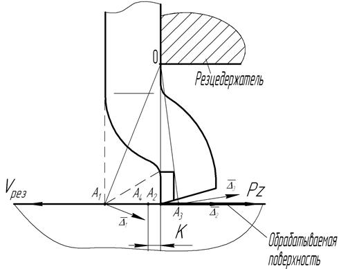 Для положения вершины резца в точке А1 вектор деформации под действием силы Рz - ∆1 будет направлен в «тело» обрабатываемой поверхности, что приведет к изменению глубины резания и возникновению вибраций – к снижению качества обработки и стойкости РИ. Для исключения этого недостатка вектор деформации в точке А должен быть параллельным обрабатываемой поверхности, что будет иметь место в точке А2.В этом случае державка резца должна быть выполнена изогнутой. Однако под действием средней составляющей силы Рz (рис. 4.33) вершина резца переместиться в точку А3 и вектор деформации будет направлен вверх, что также приведет к изменению толщины резания и вибрации. Для исключения этого недостатка вершина резца в исходном состоянии без нагрузки должна быть расположена в точке А4 на некотором расстоянии к от точки А2, где к- величина перемещения вершины резца под действием средней составляющей силы Рz, которая зависит от различных факторов и в среднем составляет 1-1,5 мм.