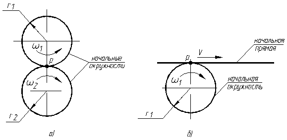 Рис. 7.1. Начальные окружности и начальная прямая при зацепления цилиндрических ЗК (а) и цилиндрического ЗК с рейкой