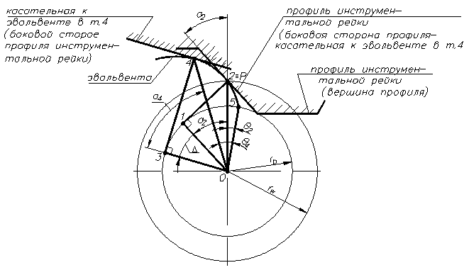соответственно углы профиля эвольвенты в т. 2 и в т. 4;