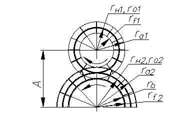 1) начальные окружности (rн, dн), по которым обкатываются без скольжения два зубчатых колеса (начальные окружности меняются при изменении межосевого расстояния);