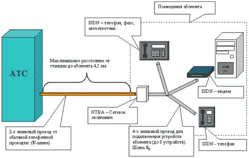 Важно заметить что, на сегодняшний день доступен широкий перечень ISDN оборудования от простейшего телефонного аппарата до многофункционального ISDN-маршрутизатора. К одной обыч-ной телефонной линии можно подключить до 8 цифровых оконечных устройств. Это могут быть однотипные устройства, например, 8 цифровых телефонных аппарата, либо комбинация разнотипного оборудования — цифровой телефон, компьютер, цифровой факс и т. д., которым может быть присвоен от одного до 8 абонентских номеров. При установке ISDN, необходимо заменить обычную телефонную розетку на устройство NTBA (Сетевое окончание).