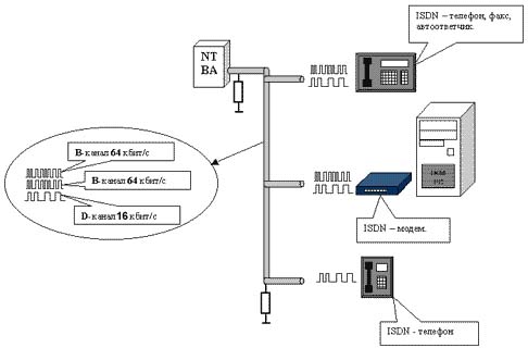 Как видно из рисунка управляющий D-канал на шине S0 имеет больший объем (64Кбит/с) чем поступает со станции, это обусловлено необходимостью организации стека протоколов взаимодействия для 8 - равноправных устройств (максимальное количество устройств ISDN на одной шине S0).