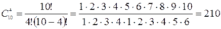 Решение. Исходное множество содержит 10 элементов, следовательно, n = 10. Вынимают 4 шара, т.е. m = 4. В условиях нашей задачи порядок элементов в получаемых подмножествах не имеет значения, следовательно, используем формулу для сочетаний