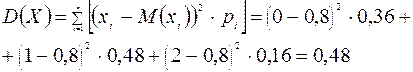 M(X) = 0×0,36+1×0,48+2×0,16=0,8.