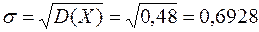 Ответ: M(X) = 0,8; D(X) = 0,48; s(X) = 0,69.