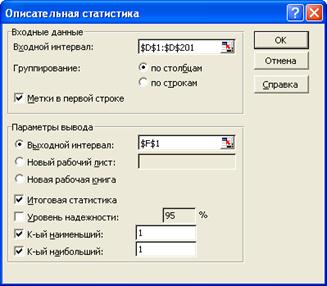 Для этого выбираем пункт меню Сервис/Анализ данных/Описательная статистика и заполняем поля диалогового окна:
