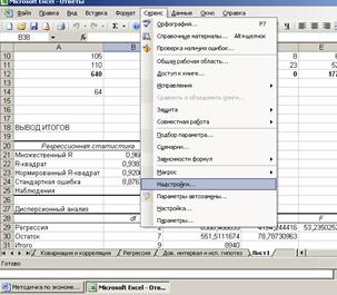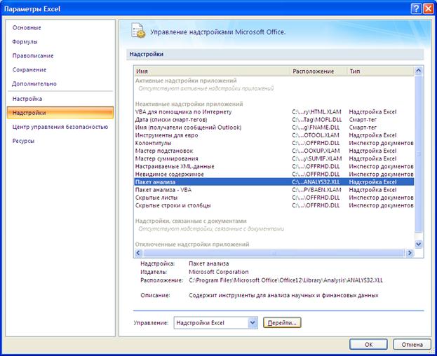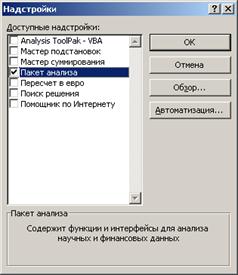 Далее в открывшемся списке нужно выбрать Надстройки, затем установить курсор на пункт Пакет анализа, нажать кнопку Перейти и в следующем окне включить пакет анализа.