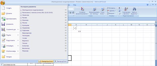 В Excel 2007 для включения пакета анализа надо нажать перейти в блок Параметры Excel, нажав кнопку в левом верхнем углу, а затем кнопку «Параметры Excel» внизу окна: