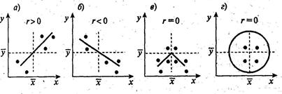 На рисунках отражен геометрический смысл коэффициента корреляции. На рисунках а и б случайные величины X, У коррелированы (r > 0 или r < 0), на рисунках в и г — некоррелированы (r = 0). Если r = 0, случайные величины могут быть как зависимыми (см. рис. в), так и независимыми(см. рис. г).