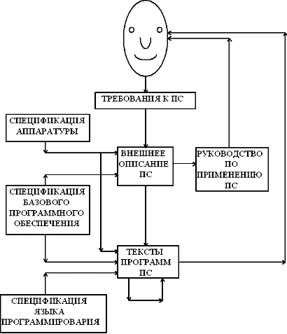При разработке и использовании ПС мы многократно имеем дело [2.3] с преобразованием (переводом) информации из одной формы в другую (см.рис.2.1). Заказчик формулирует свои потребности в ПС в виде некоторых требований. Исходя из этих требований разработчик создает внешнее описание ПС, используя при этом спецификацию (описание) заданной аппаратуры и, возможно, спецификацию базового программного обеспечения. На основании внешнего описания и спецификации языка программирования создаются тексты программ ПС на этом языке. По внешнему описанию ПС разрабатывается также и пользовательская документация. Текст каждой программы является исходной информацией при любом ее преобразовании, в частности, при исправлении в ней ошибки. Пользователь на основании документации выполняет ряд действий для применения ПС и осуществляет интерпретацию получаемых результатов. Везде здесь, а также в ряде других процессах разработки ПС, имеет место указанный перевод информации.