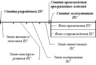 Различают следующие стадии жизненного цикла ПС (см. рис. 3.1): разработку ПС, производство программных изделий (ПИ) и эксплуатацию ПС.
