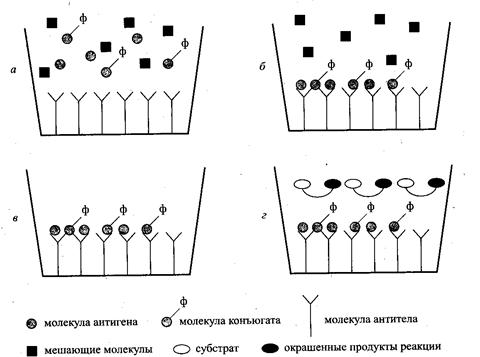 При контакте активированной поверхности носителя с раствором, содержащим антигены (например, левомицетин), часть антител специфично взаимодействует с молекулами контролируемого соединения, т. е. дезактивируется. В конкурирующем варианте ИФА контролируемый раствор смешивают непосредственно в лунке планшета с раствором так называемого конъюгата, представляющего собой молекулы антигена, химически связанные (меченые) с молекулами фермента. В течение некоторого периода инкубации планшета (от 30 мин до 2 ч) при определенной температуре антитела на поверхности носителя дезактивируются в результате иммуносорбции как меченых, так и немеченых антигенов (рис. 1 в).